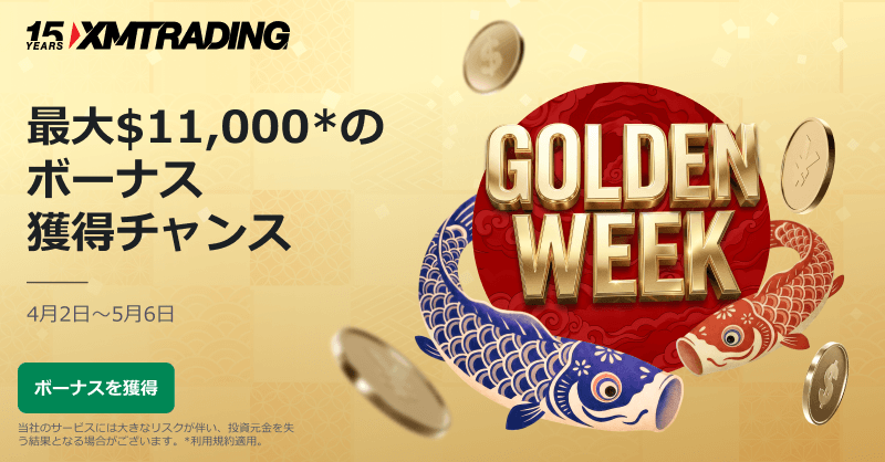 4/2〜5/6までの期間限定で開催されている「2026年 XMTrading ゴールデンウィーク100%ボーナスキャンペーン」では、最大11,000ドルの入金ボーナスを獲得できます。